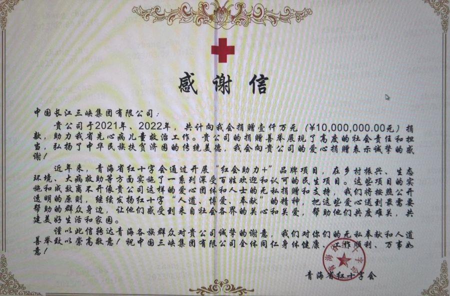 本网讯(徐强)近日,青海省红十字会向三峡集团发来感谢信,对三峡集团在青海省先天性心脏病儿童救治工作中予以的资助表示感谢。