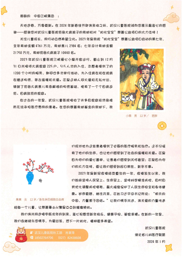 武汉儿童医院、湖北省儿科医疗联盟向三峡集团发来感谢信