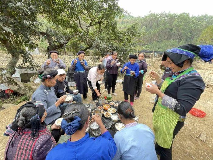 ▲在仓更镇种植基地,干完农活的村民们一边吃午饭一边交流种植心得。