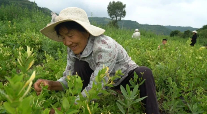 ▲ 清水县当地村民正在采摘金银花