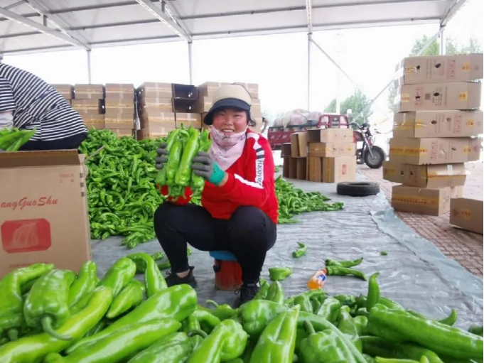 ▲ 辣椒收购点内,新鲜采摘的辣椒等待打包
