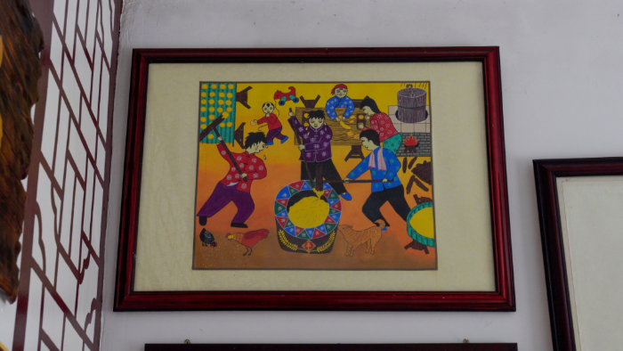 男子拿着锤棒在石槽捶打,酣畅淋漓,女子在桌台揉压面团,喜笑颜开,这是反映地方特色的《打年糕》;门前贴上了春联,门外调皮的小狗已经出来迎接,孙女搀扶着年迈的奶奶,一家人相聚其乐融融,这是充满温情的《回娘家》。