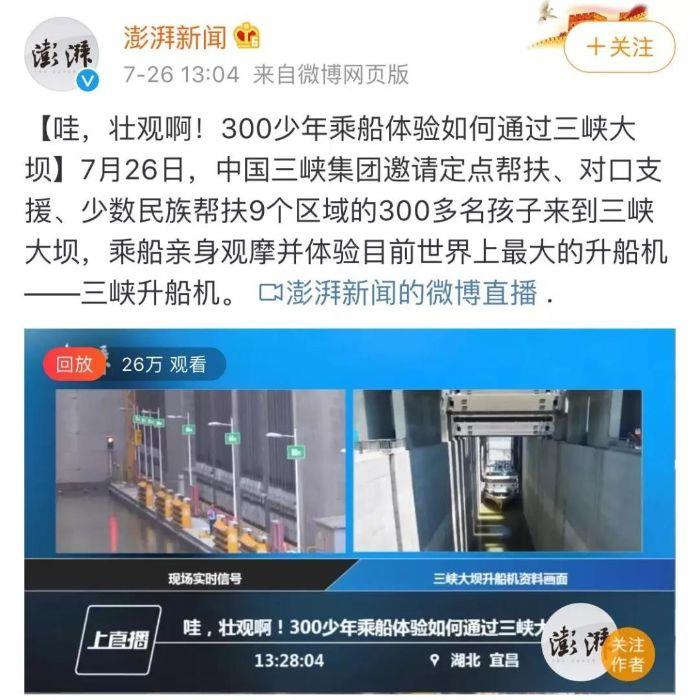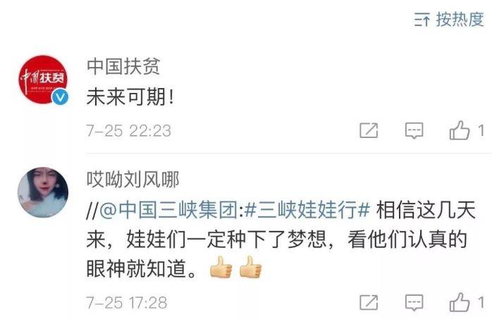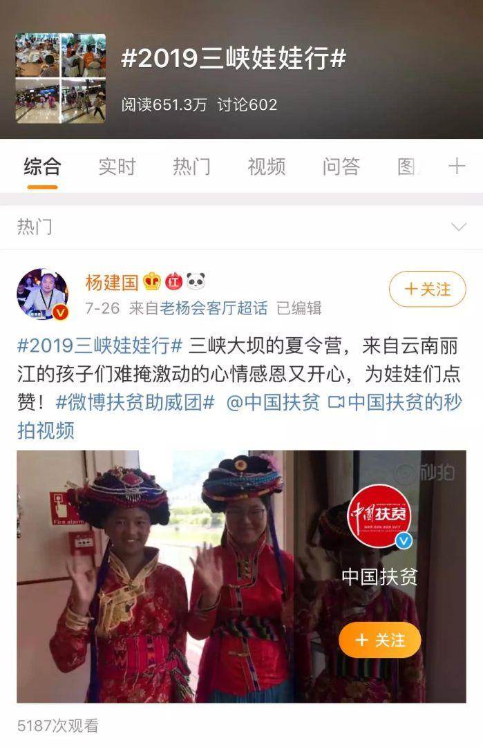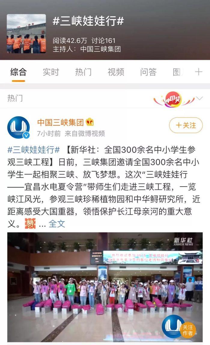 在社交媒体上,“三峡娃娃行”活动也引起了广泛关注。截至7月31日,中国扶贫微博启动的“2019三峡娃娃行”累计阅读量超过650万。三峡集团官方微博累计发送微博71条,累计阅读量约20万,启动的“三峡娃娃行”话题累计阅读量达42.6万。三峡集团官方微博累计发送微博71条,累计阅读量约20万,启动的“三峡娃娃行”话题累计阅读量达42.6万。