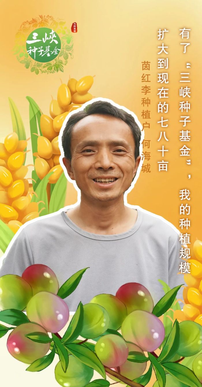 “你看这颗果子的颜色多好,吃起来肯定很甜。”多年的种植经验,让他成了半个茵红李种植专家。说起“三峡种子基金”项目,何海成充满感激,“多亏了三峡种子基金,我家茵红李种植规模从之前的二三十亩扩大到现在的七八十亩。”