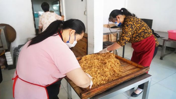 为了保证产量,张梦从镇上找来几位阿姨,“这几位阿姨都是本地人,手艺都还不错。”尽管店里聘请了五六位阿姨,但还不算最忙的时候,“一般春节前后三个月是最忙的,那段时间每天请七八个阿姨都还忙不过来”。