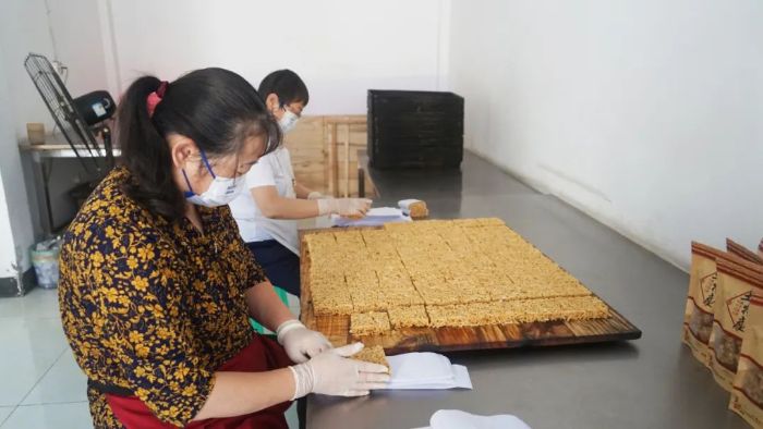 “把刚出锅的苕耙丝铺在特制的木框里,再用木棒将其压紧压实,这是苕耙丝制作的最后一个步骤,一会儿趁热切成小块就能包装了。”制作苕耙丝的步骤,张梦已熟记在心,一步接一步的循环,构成了张梦的日常。代代相传的好手艺,让张梦的生意很快走上正轨,她的产品不光受到周边街坊的青睐,经销商也常常开出大订单。