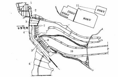 厂房 坝后式厂房,共装5种混流式水轮发电机组。初期工程共安装3台180MW和7台303MW机组,1号厂房总装机容量达2660MW。二期工程增 建2号厂房,厂房安装10台水轮发电机组,水轮机转轮直径7.2m,转速112.5r/min,额定水头为130m时,流量512m3/s, 额定出力610MW;水头为146m时,最大出力730MW。发电机额定功率700MV·A,最大功率805MV·A。每台发电机接3台 268.5MV·A单相变压器组成的发电机变压器单元组,升压至400kV和800kV。初期工程的机组,因水头提高,总容量提高到3000MW。