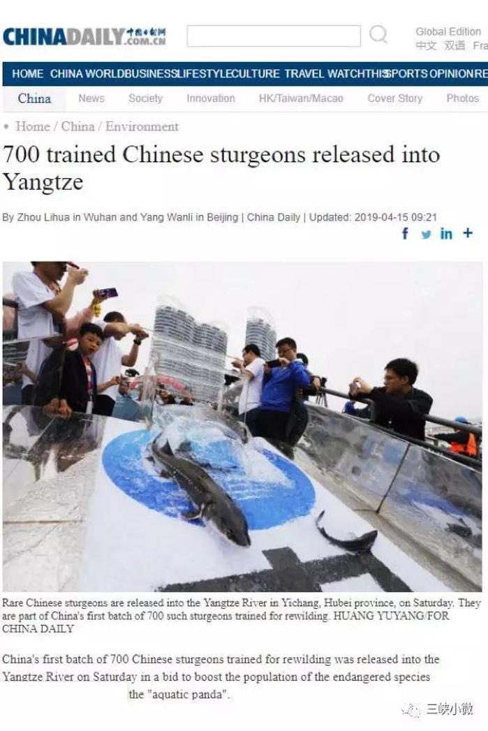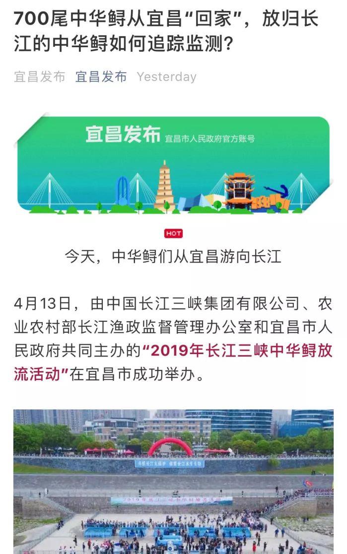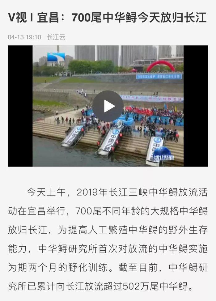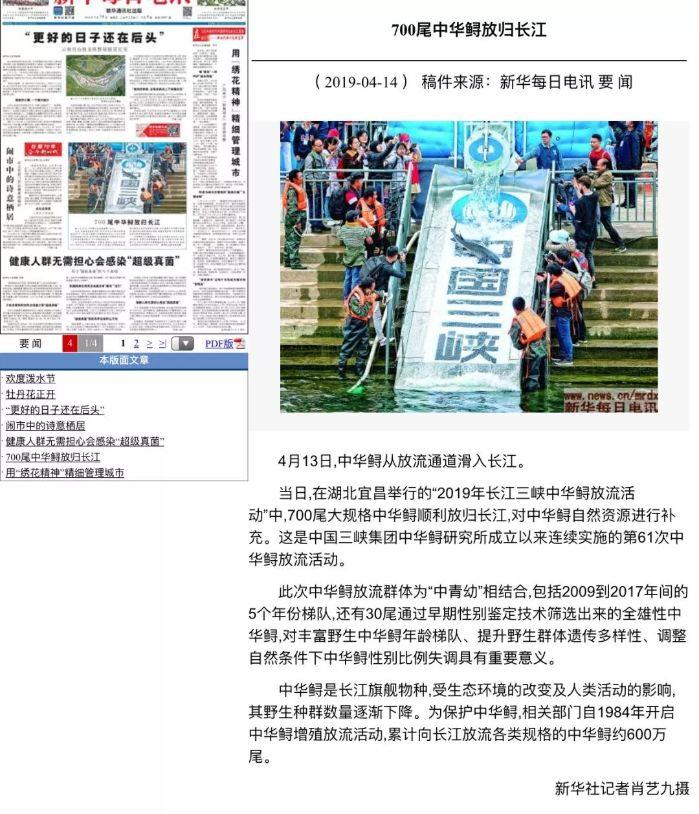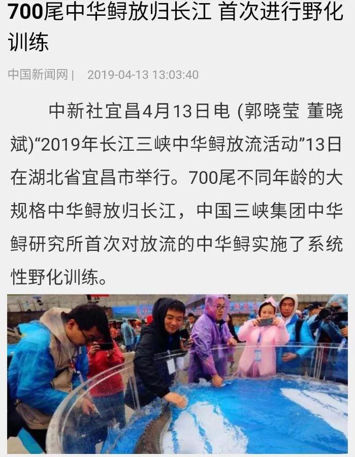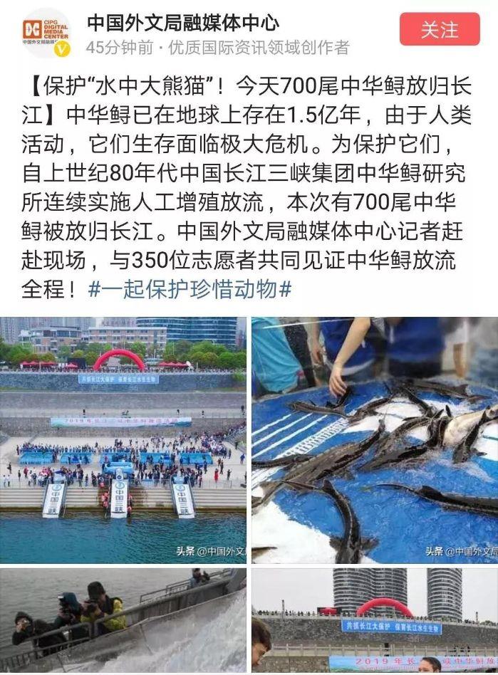 本网讯(李长辉 徐瑶)4月13日,以“共抓长江大保护、保育长江水生生物”为主题的2019年长江三峡中华鲟放流活动在宜昌圆满结束,700尾子二代中华鲟放归长江。消息出来后,国内外各大媒体一直给予关注,报道的热度和力度势头强劲。