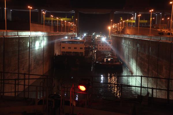 | 首条帝豪3号货轮(左一)驶入南一闸室。(刘华 摄) |