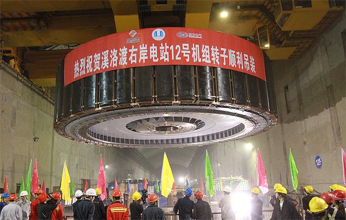 溪洛渡右岸电站12号机组转子顺利吊装。(邱伟东 摄)