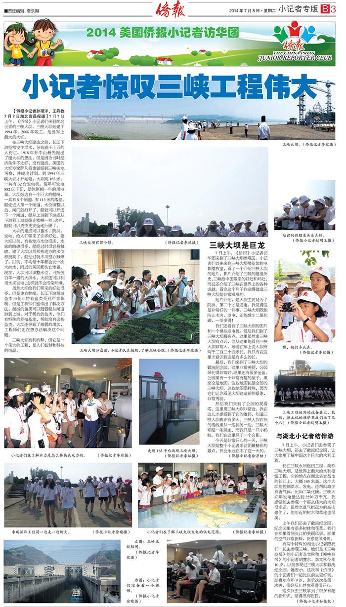 据了解,这次《侨报》小记者团的活动主题是“探寻中国现代化之旅”,他们计划从“水路空电”四个领域,分别采访一个标志性的成果,以展现中国现代化发展的现状。其中,“水”就是三峡大坝,“路”是指高铁;“空”是指航天;“电”是指以武汉光谷为代表的光电子产业。从国外看,这些都是中国现代化进程的重要里程碑。
