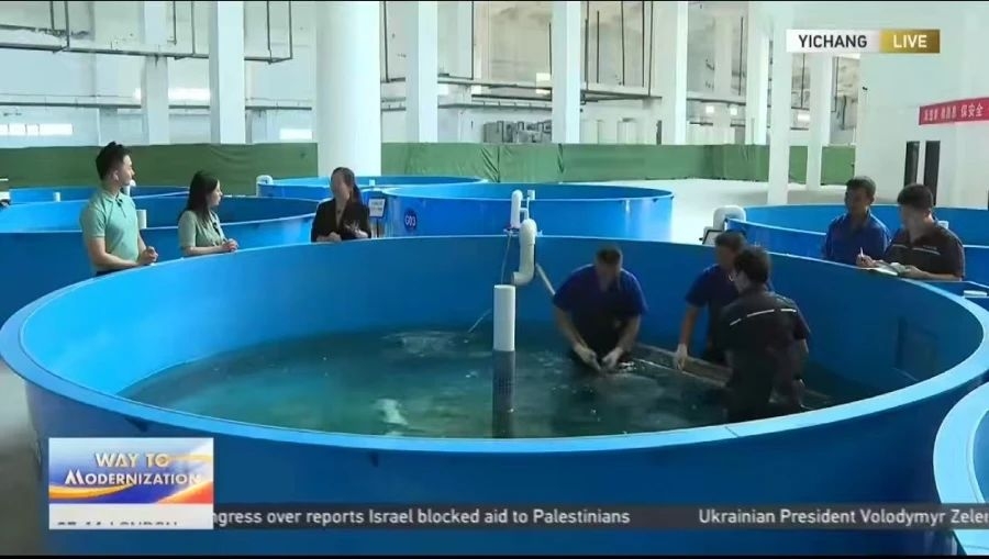 随着主持人钟石和杨菁走出展厅,镜头里出现了几十个大型圆形鱼池。眼见几位工作人员缓缓进入池子,杨菁解释道,“这是同事们在对中华鲟进行常规体检,比如测量鱼的全长和体重、检查鱼的健康状况等。这些测量可以帮助我们记录和评估中华鲟生长状况,及时调整养殖环境,以便实现中华鲟个体的最佳生长。”