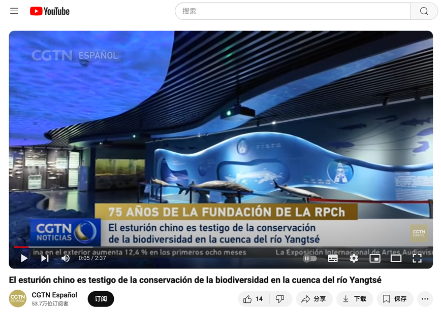▲ CGTN Youtube西语视频《探访中华鲟生活的地方 见证长江流域生物多样性保护》
