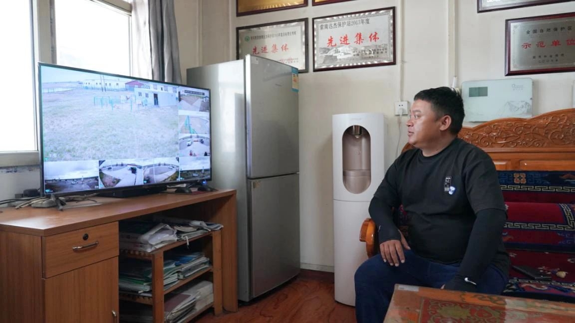 ▲ 索南达杰保护站内,站长正通过监控画面观察救助的藏羚羊幼崽