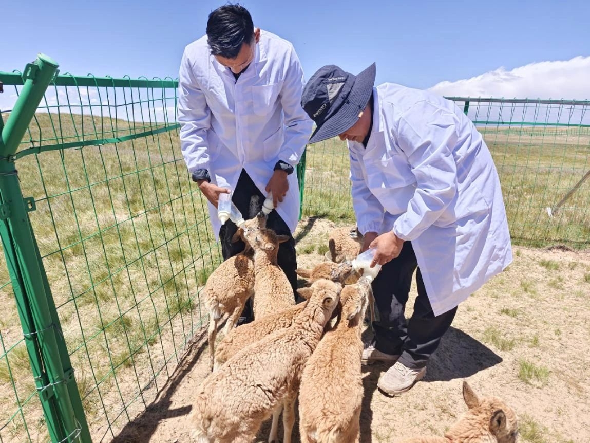 ▲ 索南达杰保护站野生动物救助中心内,工作人员正在喂养被救助的藏羚羊幼崽