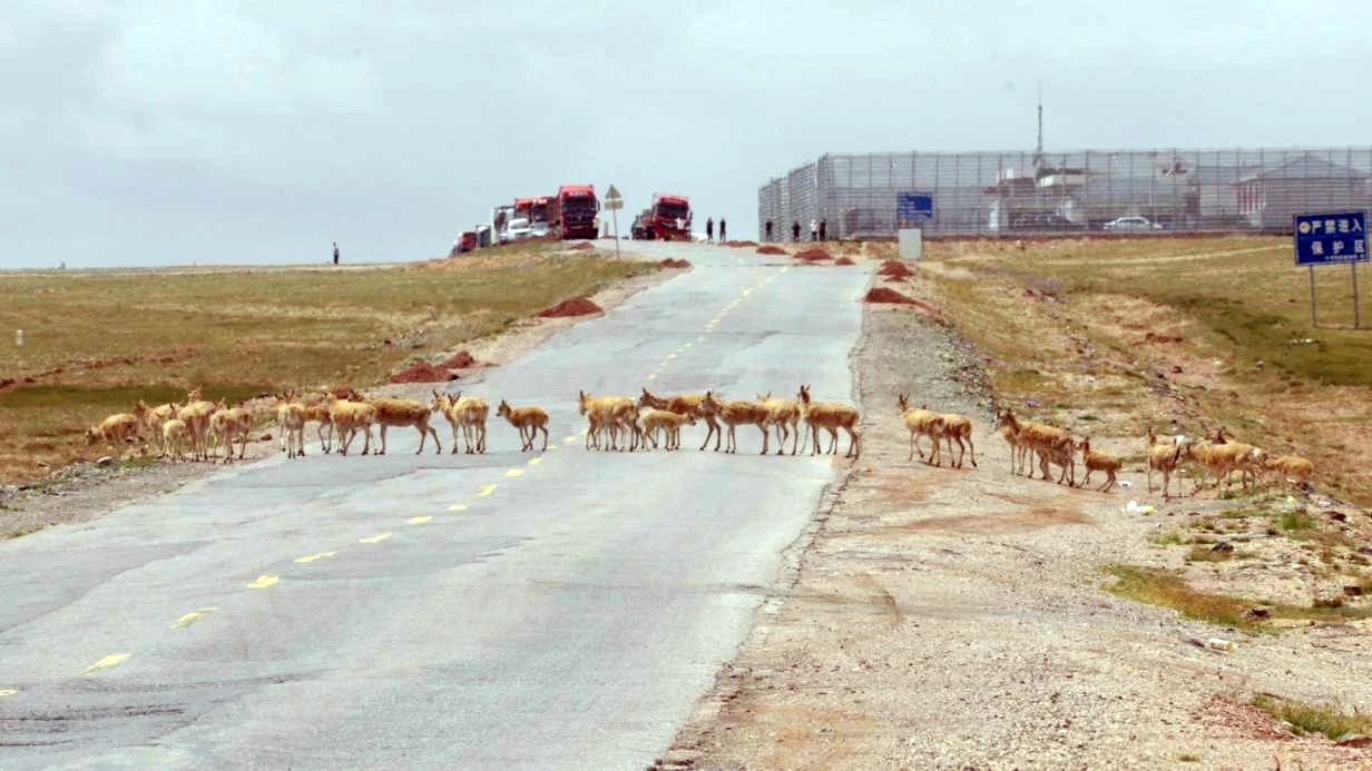 ▲ 迁徙中的藏羚羊正在通过青藏公路