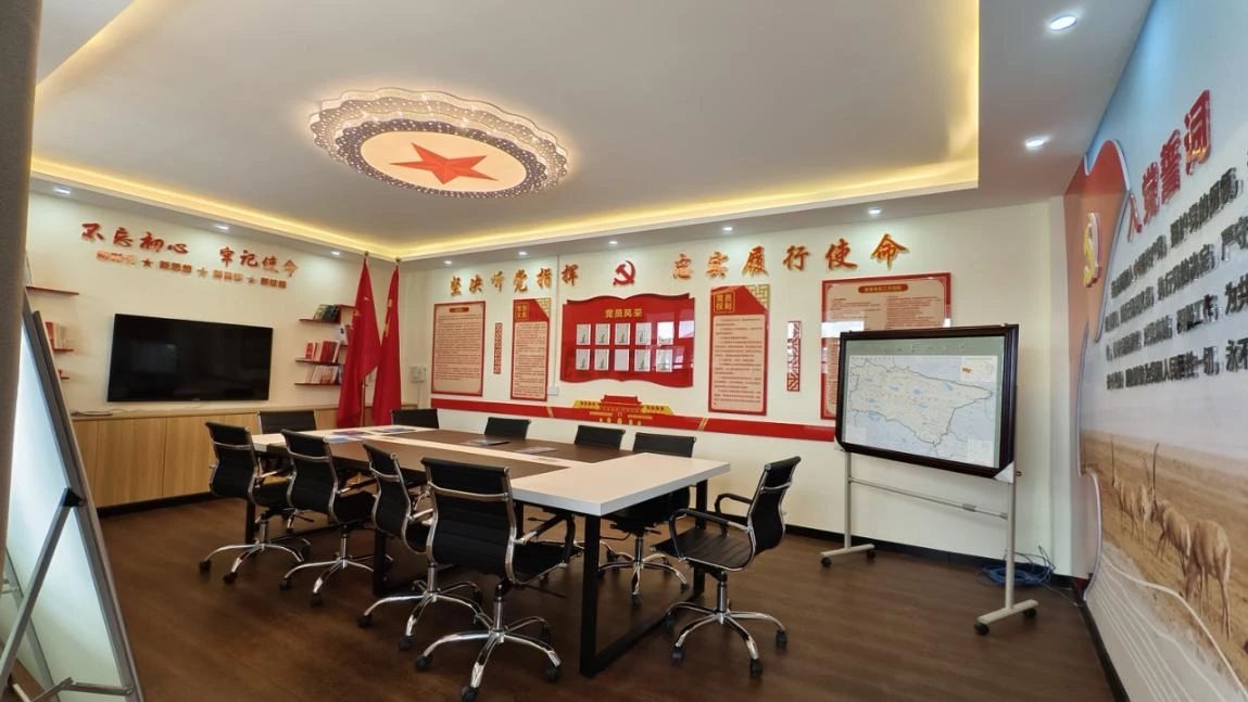在索南达杰保护站,修缮一新的党员活动中心内,吸顶灯上的五角星在灯光的照射下发出耀眼的光芒,与索南达杰保护站一墙之隔的可可西里展示大厅也加快了建设进度。