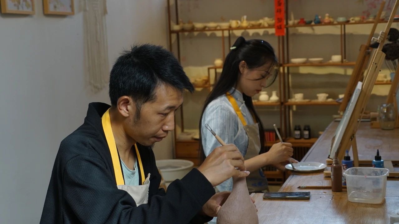 ▲ 2024年10月,重庆万州五土村民宿清水莲心的主人——郦江渝、雷小钰夫妻正在工作室完成作品 摄影:孙钰芳