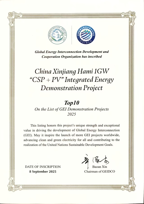 哈密“光伏+光热”项目全容量并网后,年平均发电量达20.67亿千瓦时,每年可节约标准煤约62万吨,减排二氧化碳超过163万吨,相当于植树造林852平方公里,在沙戈荒地区探索出能源开发与生态保护协调发展的可持续路径,为全球可再生能源消纳和荒漠治理贡献了中国智慧和中国方案。