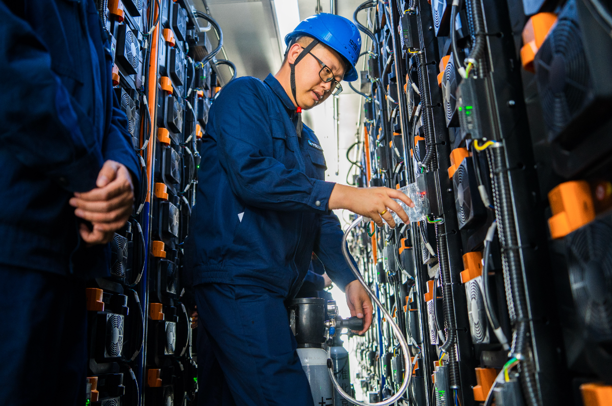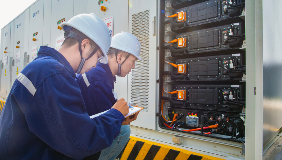 ▲ 三峡乌兰察布新一代电网友好绿色电站示范项目运维人员对储能设备进行检查