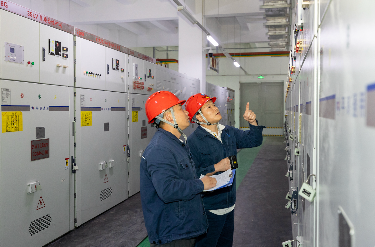 ▲ 三峡滨海储能电站两名运维人员在电站储能区巡检,确保设备安全稳定运行