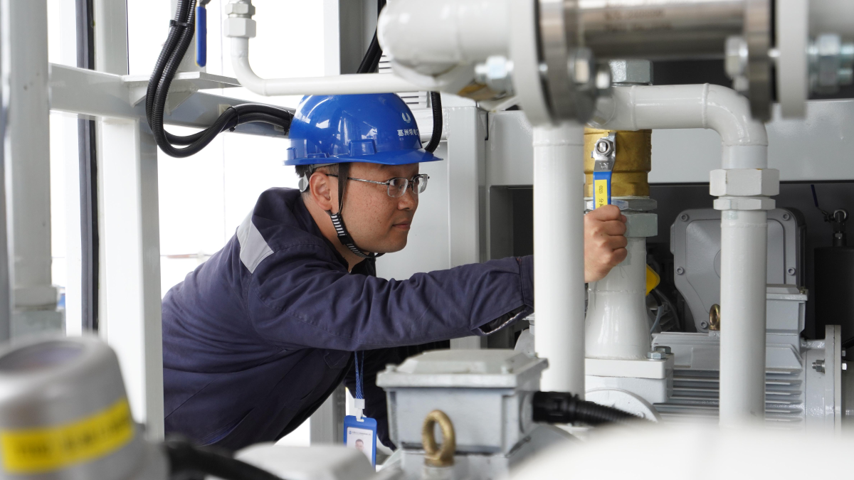 ▲ 检修人员在检查滤油机阀门工作状态 摄影:陈臣