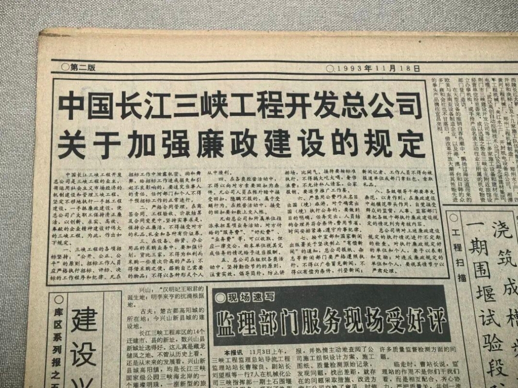 本网讯(王璐)三峡工程博物馆珍藏着一张旧报纸——1993年11月18日出版的《中国三峡工程报》。报纸左上角刊发了《中国长江三峡工程开发总公司关于加强廉政建设的规定》(以下简称《规定》),不到一千字的朴实字句条条紧扣工程建...
