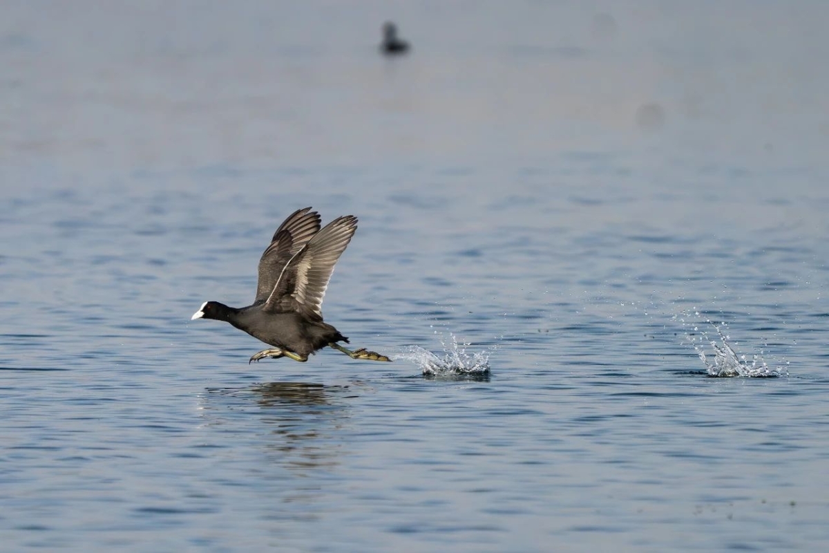 ▲ 红旗湖上白骨顶正在踩水掠波 摄影:胡九思