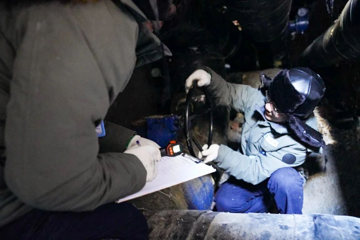 ▲ 为保障安全稳定供暖,项目员工在阴暗狭窄的地下检修供暖管路