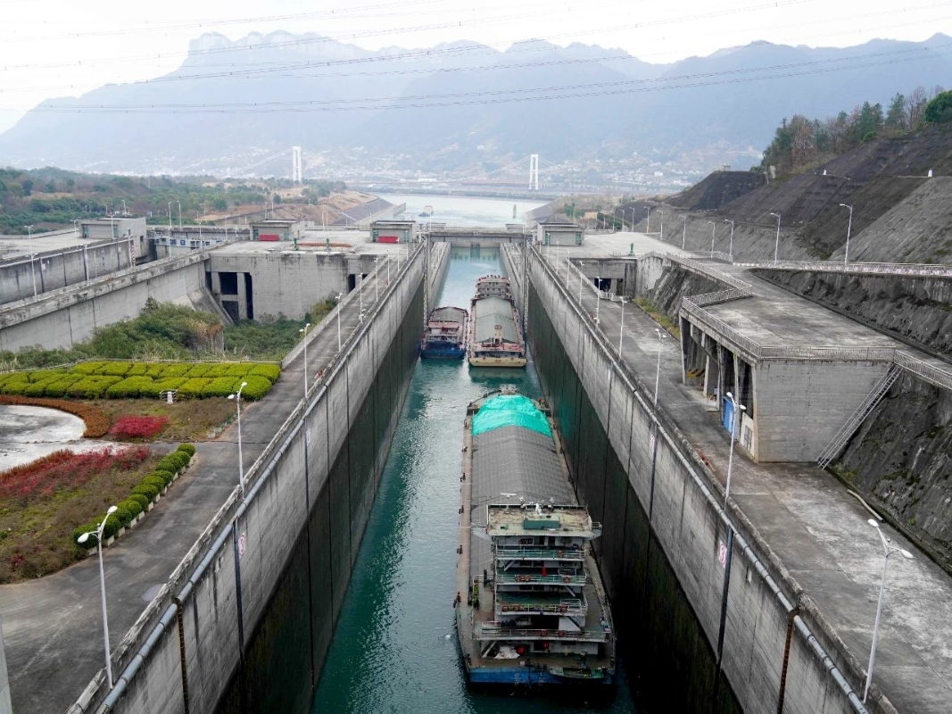 本网讯(秦明硕 米福)1月14日是春运的第一天,随着三峡双线五级船闸南线六闸首大门缓缓打开,4艘船舶满载钢铁、煤炭等货物,列队驶入长280米、宽34米的闸室,有序过闸,现场一派繁忙景象。