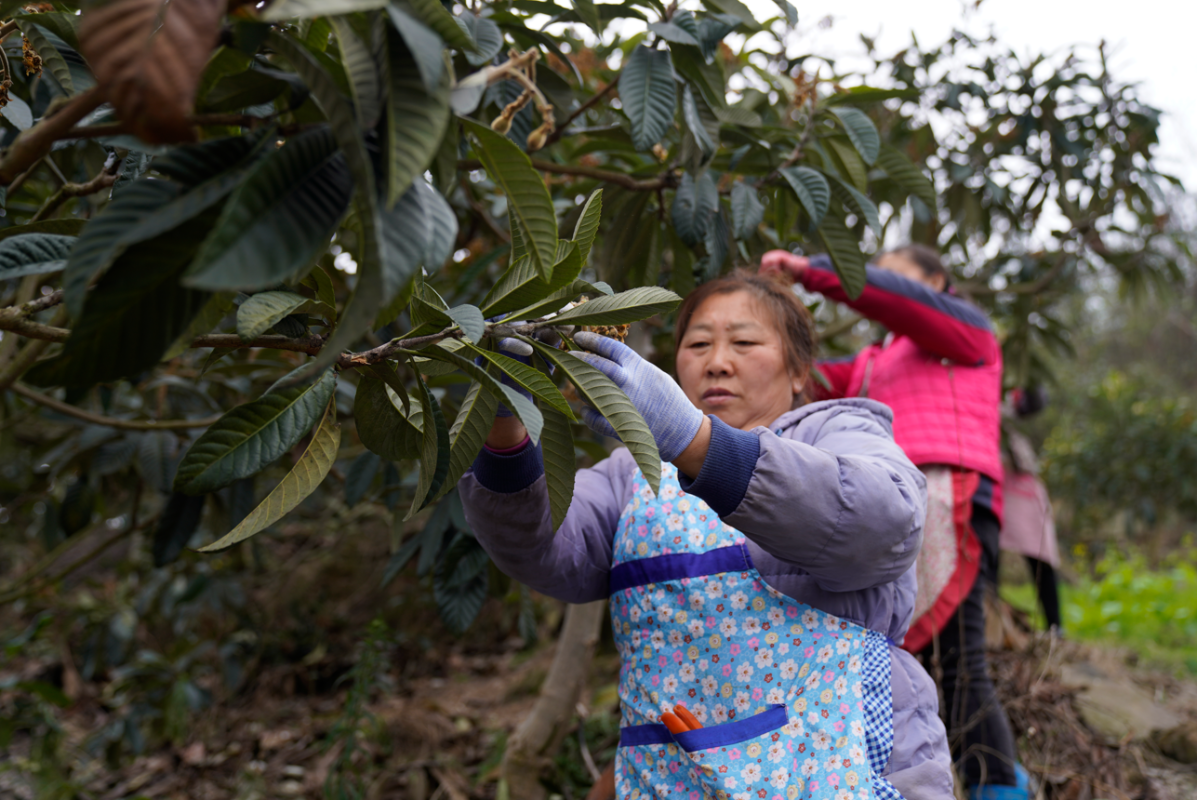 ▲村民正在给枇杷疏花 摄影:杜健伟