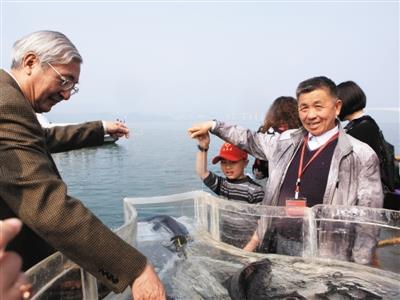 中国人与生物圈国家委员会主席、中科院院士、北京大学原校长许智宏(左),与山西孝义市兑镇小学退休教师冯长清(右),共同放流中华鲟。 黄正平 摄