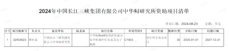 8月23日,国家自然科学基金委员会公布了2024年度国家自然科学基金立项名单,中国长江三峡集团公司中华鲟研究所成功获批国家自然科学基金青年基金项目1项。