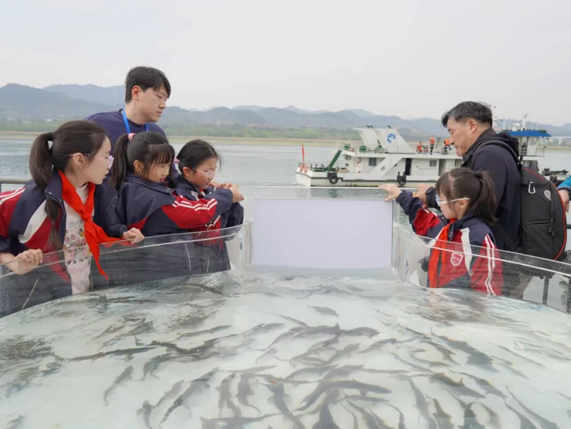 ▲ 3月28日,在中华鲟增殖放流现场,小志愿者们正在放归中华鲟。摄影:毛翔春